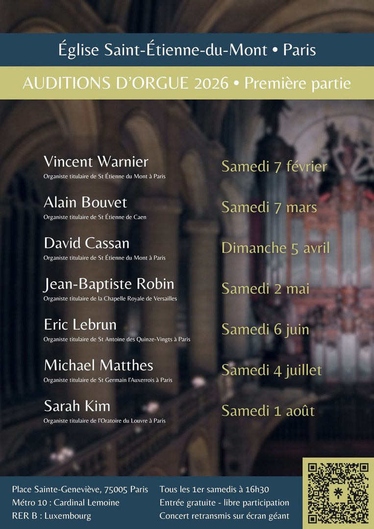 Une nouvelle saison de récitals d'orgue s'ouvre en 2026 à St-Etienne-du-Mont, place du Panthéon, Paris, (métro ligne 10 : Cardinal Lemoine ; RER B : Luxembourg)